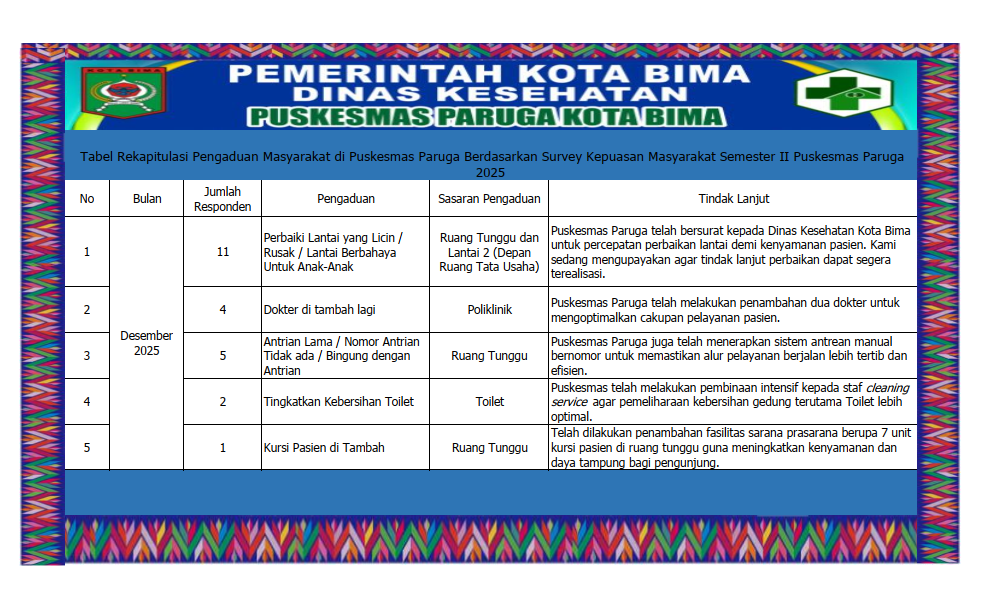 Meski demikian, manajemen Puskesmas Paruga tetap menaruh perhatian serius pada saran perbaikan yang masuk. Berdasarkan rekapitulasi pengaduan pada Desember 2025, terdapat beberapa poin utama yang menjadi fokus perhatian masyarakat: