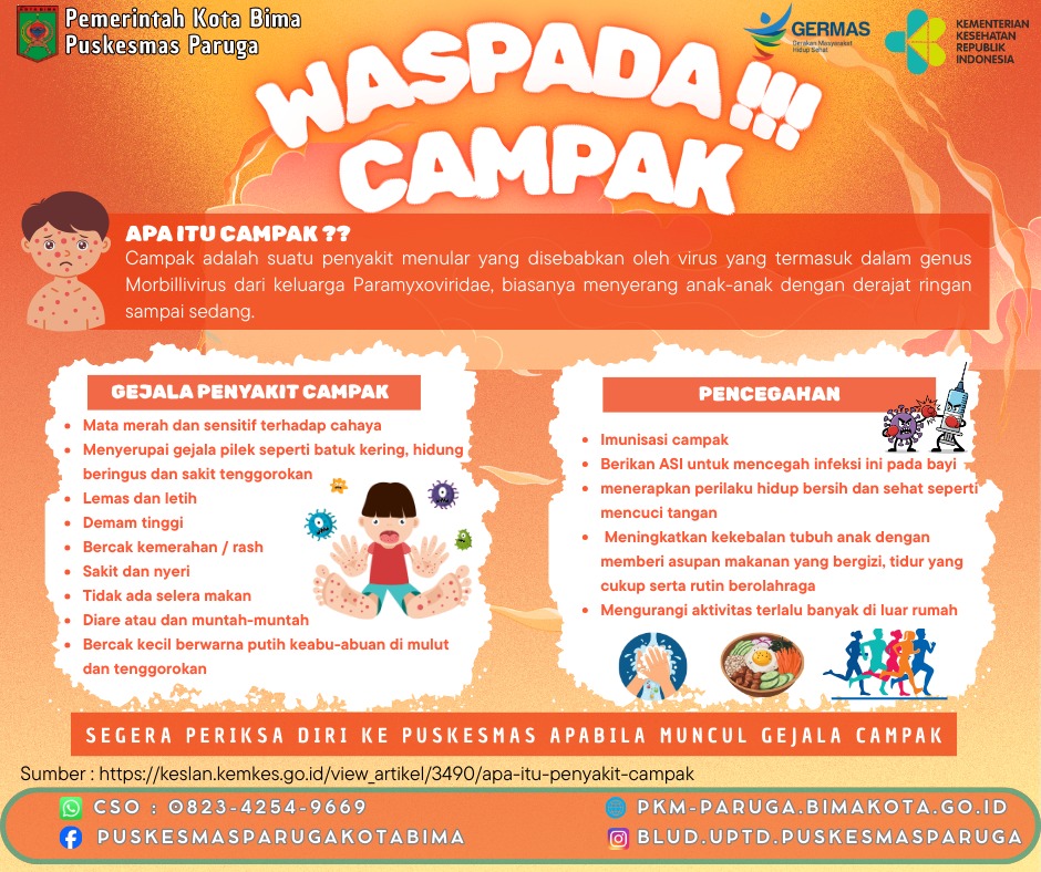 KOTA BIMA, Maret 2026 - Menindaklanjuti upaya pencegahan penyakit menular , kami memberikan imbauan kepada seluruh masyarakat khususnya di wilayah kerja Puskesmas Paruga - Kecamatan Rasanae Barat - untuk meningkatkan kewaspadaan terhadap penyebaran penyakit Campak.