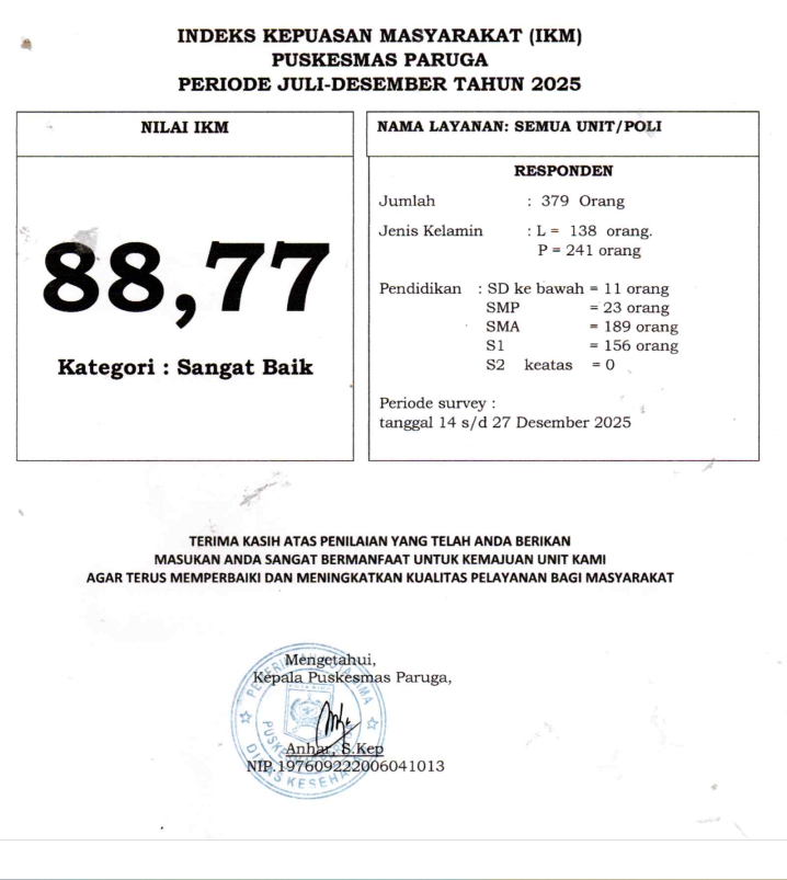 Puskesmas Paruga telah merilis laporan Indeks Kepuasan Masyarakat (IKM) untuk periode pelayanan Juli hingga Desember 2025 yang mencakup seluruh unit atau poli layanan. Dalam laporan tersebut, Puskesmas Paruga berhasil memperoleh skor IKM sebesar 88,77, yang menempatkan kualitas pelayanannya dalam kategori Sangat Baik.