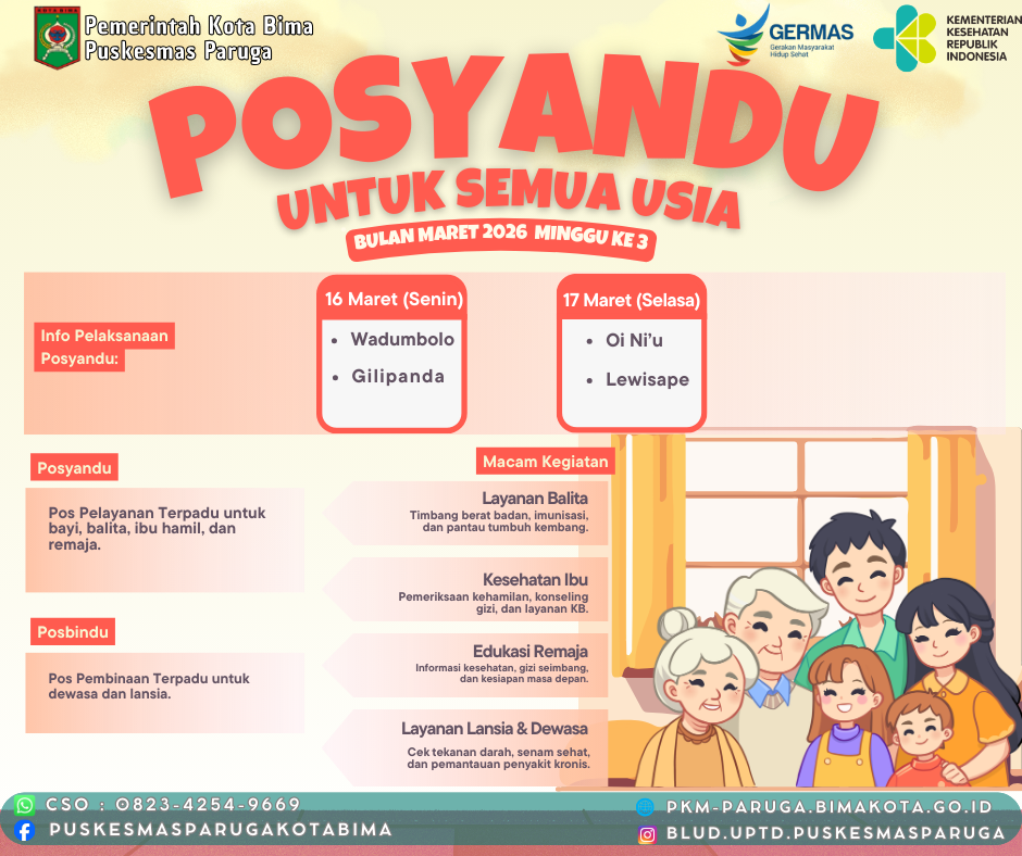 Puskesmas Paruga kembali hadir dengan layanan Posyandu untuk Semua Usia pada Minggu ke-3 Maret 2026. Catat lokasi dan tanggalnya ya!