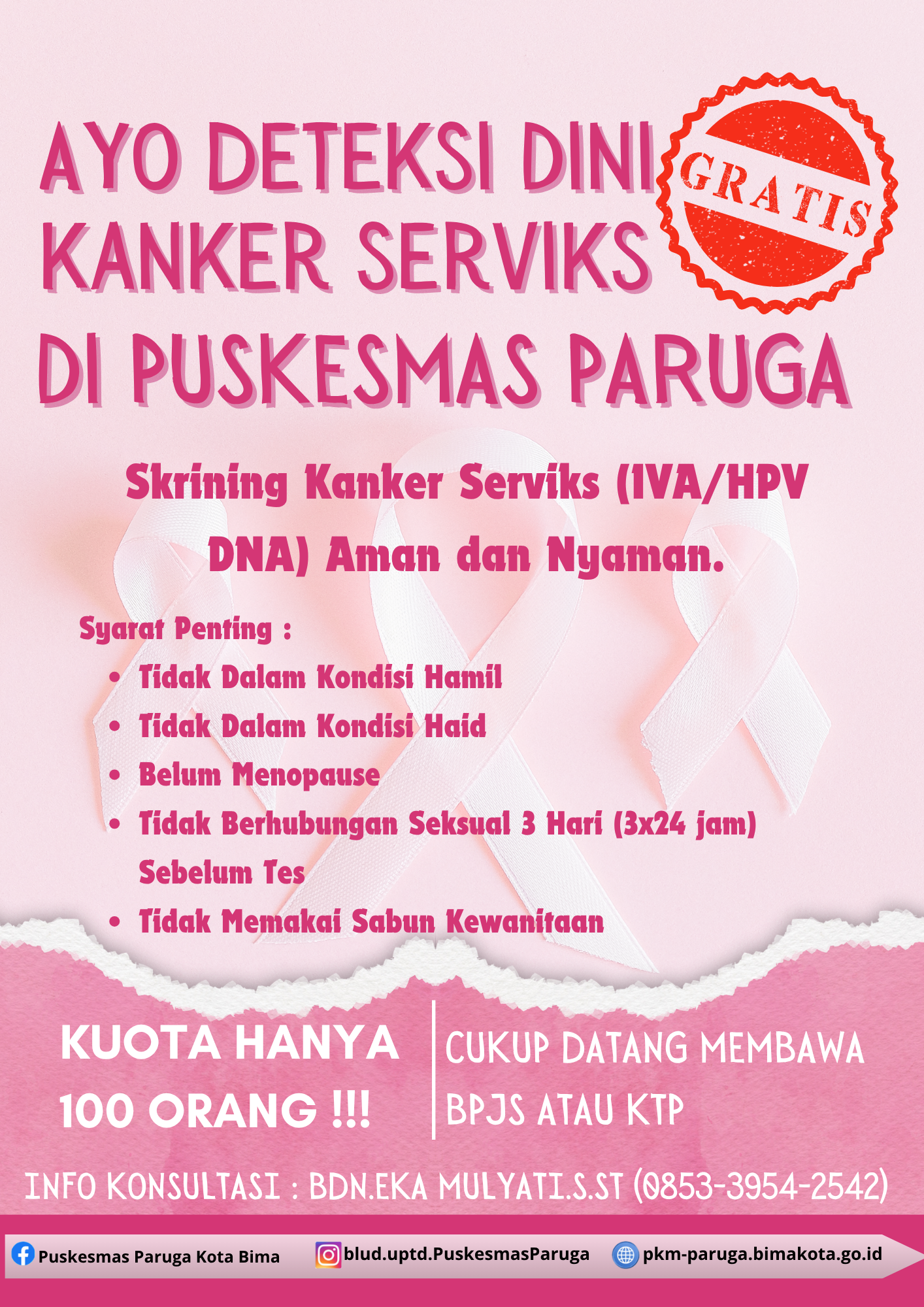Puskesmas Paruga mengajak Bunda sekalian untuk segera memanfaatkan program Deteksi Dini Kanker Serviks (IVA/HPV DNA Tes) secara GRATIS. Pemeriksaan yang aman dan nyaman ini bertujuan untuk mendeteksi perubahan pra-kanker pada leher rahim (IVA) atau keberadaan virus penyebab kanker (HPV DNA), sehingga pengobatan dapat dilakukan dengan mudah dan mencegah penyakit berkembang sebelum menjadi kanker yang sulit ditangani.