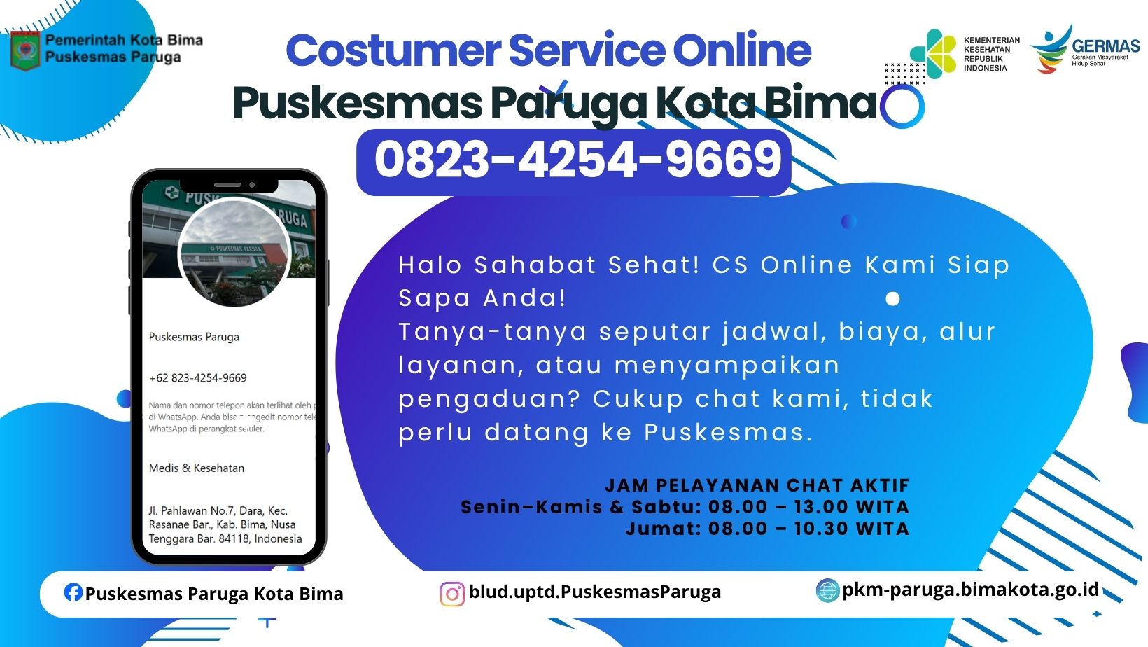 Puskesmas Paruga Kota Bima secara resmi meluncurkan inovasi digital "Customer Service (CS) Online". Layanan berbasis chat ini dirancang untuk memodernisasi dan meningkatkan efisiensi layanan publik, memungkinkan masyarakat mengakses informasi kesehatan secara cepat dan transparan tanpa harus berkunjung ke fasilitas kesehatan.