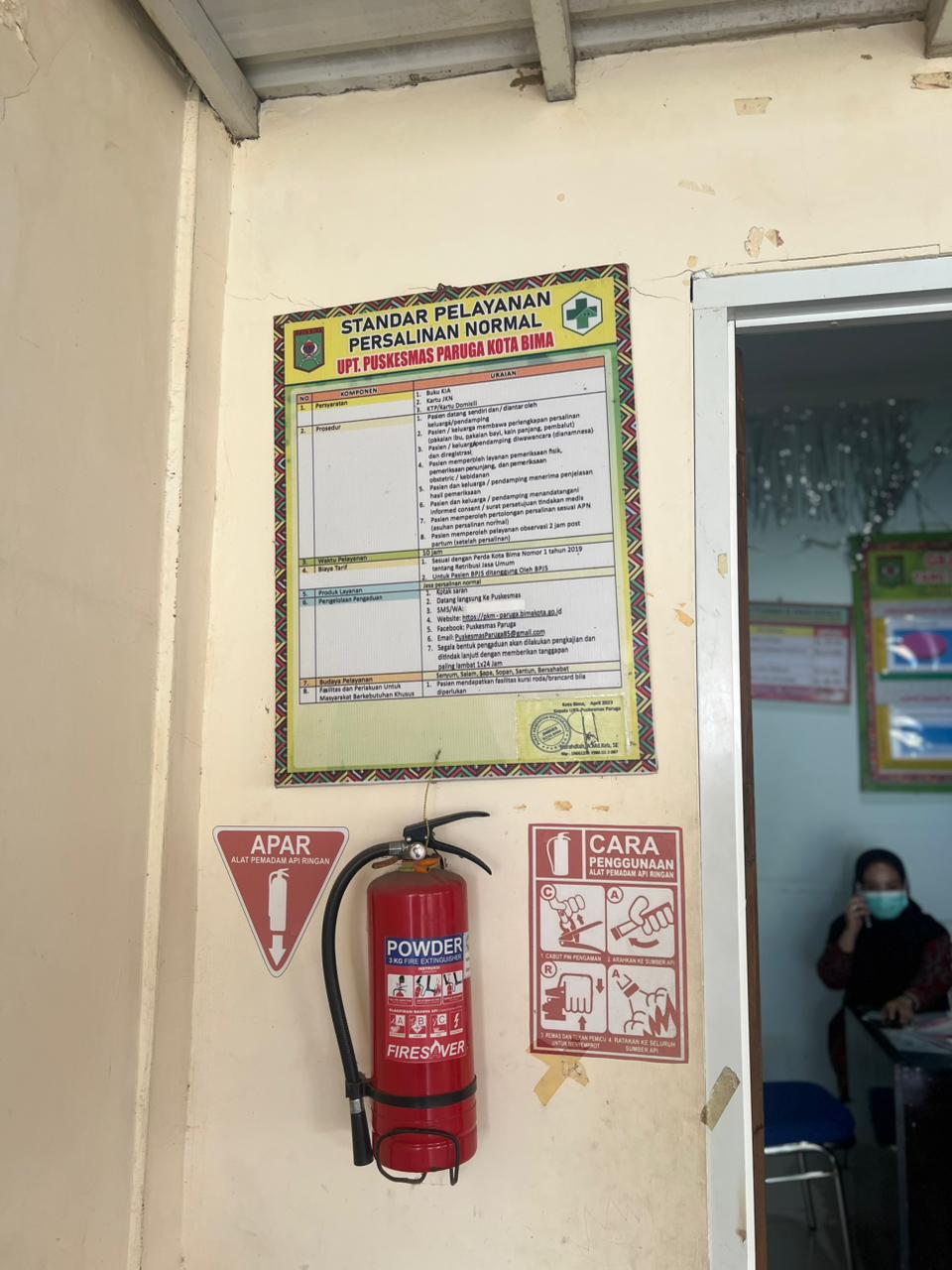 Puskesmas Paruga menempatkan keselamatan pengunjung dan staf sebagai prioritas utama melalui penyediaan fasilitas Alat Pemadam Api Ringan (APAR) yang tersebar secara strategis di titik pelayanan untuk memastikan mitigasi risiko kebakaran dapat dilakukan secara cepat dan tepat. Setiap unit APAR. Keberadaan sistem proteksi kebakaran ini merupakan wujud komitmen Puskesmas Paruga dalam menghadirkan sarana kesehatan yang aman, responsif, dan protektif bagi seluruh masyarakat Kota Bima yang datang berkunjung.