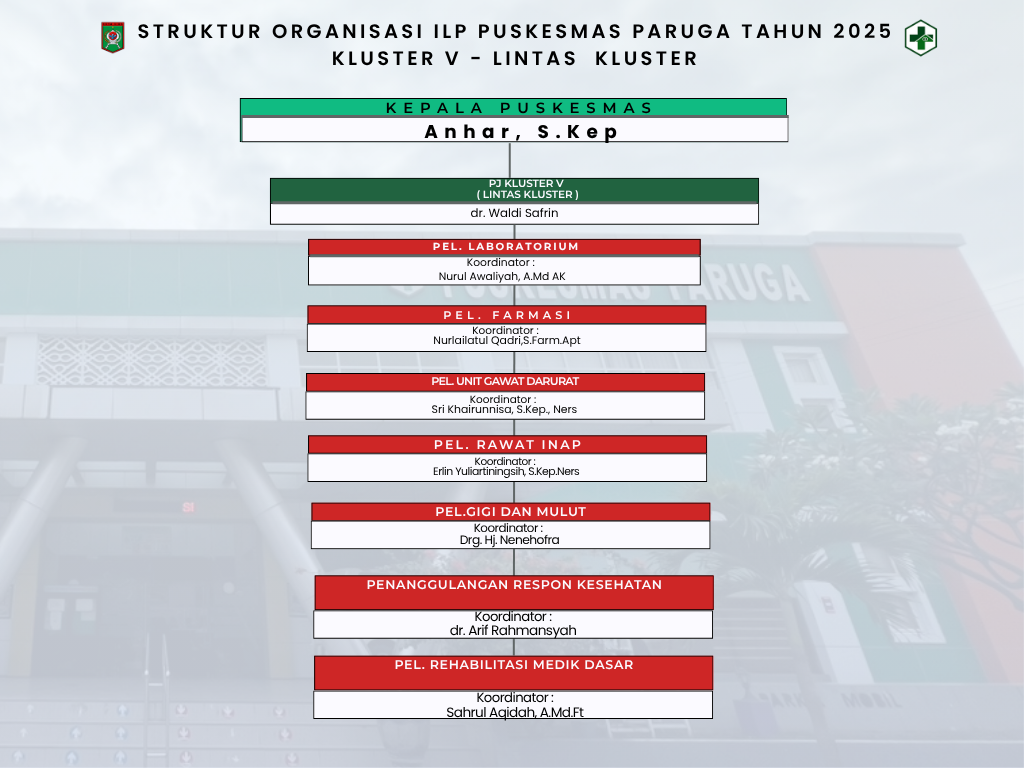Kluster V Puskesmas Paruga dikenal sebagai Lintas Kluster karena fungsinya adalah menyediakan pelayanan penunjang dan pelayanan kuratif (pengobatan) spesialis yang mendukung seluruh kluster pelayanan kesehatan lainnya (Ibu dan Anak, Dewasa dan Lansia, Penyakit Menular, dll.). Kluster ini memastikan ketersediaan sumber daya esensial dan kesiapan darurat.